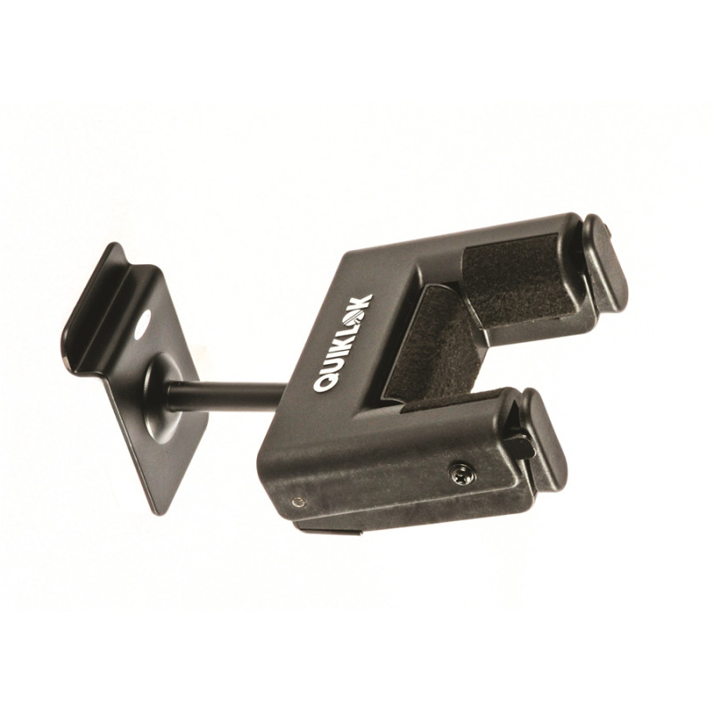Sostegno per chitarra con bloccaggio automatico del manico. Il supporto può ruotare di 180° ed essere regolato a destra o a sinistra di un angolo qualsiasi. La forcella può ruotare orizzontalmente per adeguarsi a disegni regolari o irregolari della paletta.