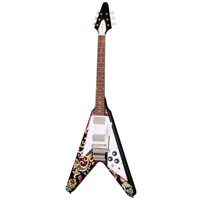 Ora Epiphone, in collaborazione con Gibson Custom e la famiglia Hendrix, è orgogliosa di presentare la Jimi Hendrix “Love Drops” Flying V™, una ricostruzione Inspired by Gibson Custom di una chitarra che Jimi ha suonato a lungo nel periodo 1967-1969.