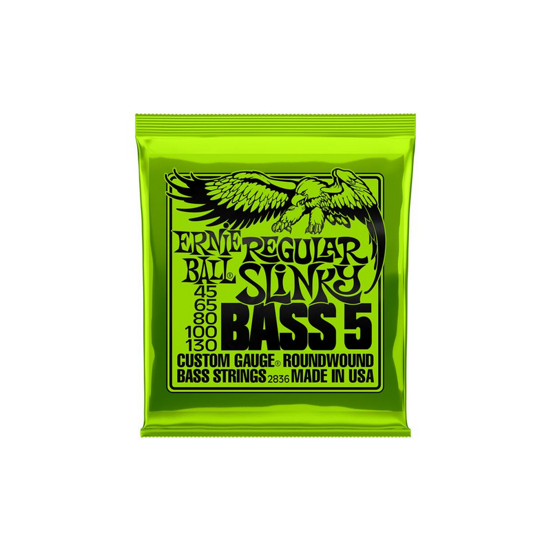 Ernie Ball Regular Slinky 5 String Bass sets are wound for a bright, balanced tone. Each bass string is manufactured with the finest and freshest raw materials in the beautiful Coachella Valley of Southern California. The list of endorsers for Ernie Ball Slinky bass strings reads like a who's who of top selling artists. Gauges .045, .065, .080, .100 .130