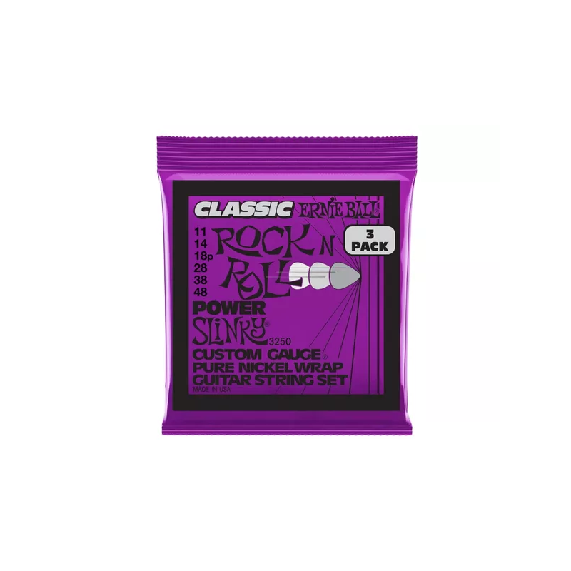 CORDE 3250 è il pack da tre set di corde per chitarra elettrica della serie "Power Slinky" di casa Ernie Ball con scalatura 0.11 - 0.48. Sono realizzate con un filo in puro nichel avvolto su un'anima esagonale in acciaio placcato a stagno. Producono un suono caldo e ricco di armoniche, ideali per musica rock.