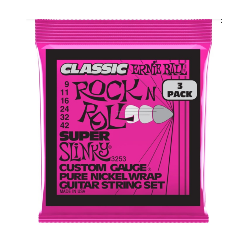 CORDE 3253 è il pack da tre set di corde per chitarra elettrica della serie Super Slinky Classic Rock N Roll con scalatura 9-42 di casa Ernie Ball. Sono costruite con un filo in puro nichel avvolto su un'anima esagonale in acciaio placcato a stagno, producendo un suono caldo e ricco unito all' inconfondibile sensazione Slinky al tatto.
