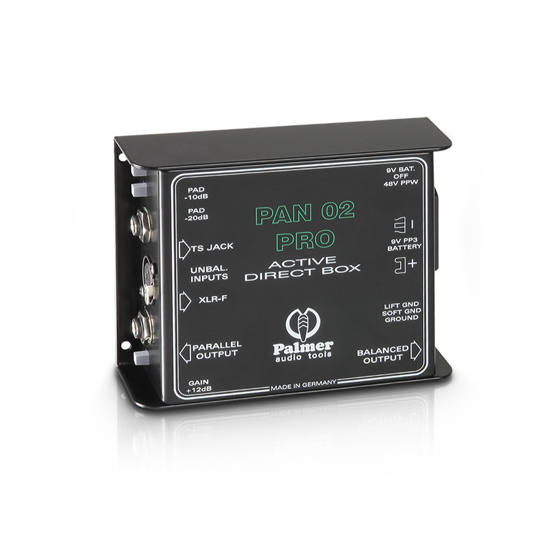 The Palmer PAN02 PRO is an active DI-box with outstanding additional functions. These include an unbalanced XLR input, in addition to the 3-way attenuator -10, -20, -30 dB and a switchable gain of 12 dB, connected with a maximum output voltage of +20 dBu. The Groundlift switch has a "lift" position allowing adjustments between a "soft and hard grounding" . The balanced output is achieved with a high quality transformer in the Mumetall housingthat was specially developed for this purpose. The PAN02 Pro can be powered either with a 9 V battery or 48 V phantom power. A two-colour LED indicates which source supplies the power.
