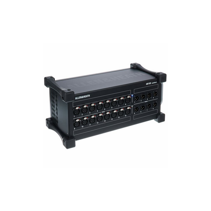 AB168 è un interfaccia audio portatile da utilizzare con le serie di mixer Allen & Heath GLD e Qu in applicazioni live e installazioni. Dotato di 16 preamplificatori microfonici con indicatori di alimentazione Phantom e 8 uscite di linea XLR, grazie al protocollo dSNAKE di proprietà Allen & Heath, l'Audio Rack AB168 è compatibile con i mixer della gamma Qu e GLD. Integrare un sistema Qu o GLD con un rack AB168 consente di posizionare alcuni o tutti gli I/O fino a 120m dal mixer. L'unità si collega ai mixer Qu/GLD attraverso un singolo cavo Cat5 o all'AudioRack AR2412 mediante la porta dSNAKE EtherCon. E' presente una seconda porta EtherCon per il collegamento ad un altro rack AB168 o al sistema ME personal mixing. AB168 effettua l'auto-aggiornamento del firmware per sincronizzarsi con il sistema. La progettazione robusta del rack, dotato di protezioni in gomma, lo rende adatto ai tour e consente di posizionarlo sul palco durante le esibizioni live. Con un peso di soli 4,8kg e una robusta maniglia per il trasporto, AB168 è progettato per la massima praticità e trasportabilità. E' disponibile un kit opzionale per il montaggio a rack.