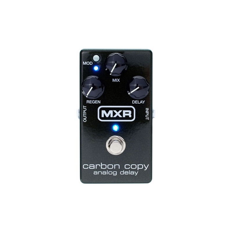 L'M169 Carbon Copy Analog Delay di MXR è dotato di un percorso audio completamente analogico per fornirvi un delay ricco e caldo; questo è possibile solo grazie alla tecnologia "bucket brigade"della vecchia scuola (sviluppata nel 1969 da F. Sangster e K. Teer: il segnale analogico memorizzato viene spostato lungo la linea di condensatori, uno step ogni ciclo di clock). Questo progetto vanta uno straordinario tempo di ritardo (Delay Time) di 600ms con modulazione opzionale selezionabile tramite interruttore e con tre semplici manopole che controllano il tempo di ritardo (Delay Time), la miscelazione dell'effetto (Mix), e la lunghezza dell'effetto (Regen), il tutto in un pedale non più grande di un Phase 90. Inoltre due Trim interni offrono all'utente la possibilità di regolare ampiezza (Width) e velocità (Rate) di modulazione, per avere ulteriori possibilità timbriche. Il Carbon Copy spazierà da un eco frizzante tipo "Bathroom " agli epici delay alla Gilmour con la sola rotazione di una manopola. True-Bypass, alimentazione a 9 volt ed un LED da palco di colore blu completano il tutto.