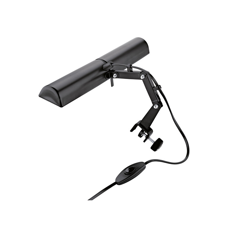 Double music stand light (320 mm) with black light shades. Three-way tilt adjustment for precise placement. Two meter electrical cable with on-off switch and Euro-style plug. Two tubular bulbs included. Uses only tubular bulbs with a maximum rating of 25 watts. In-door use only. CE-mark.
