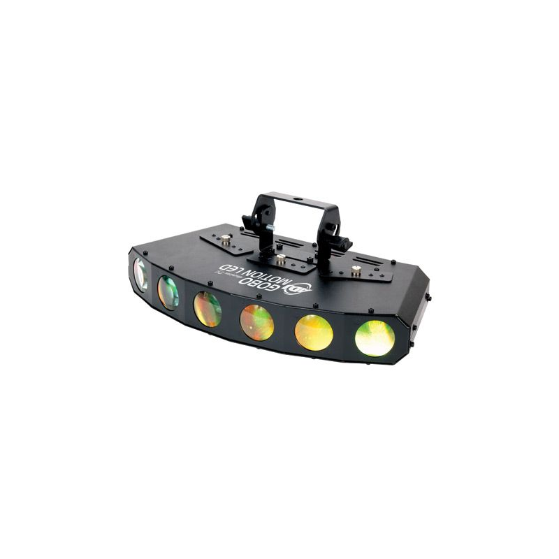 Gobo Motion LED di American DJ è caratterizzato da veloci fasci colorati Tri LED con 6 motivi gobo sostituibili. I gobo possono essere rimossi e l'apparecchiatura può essere utilizzata con 6 fasci luminosi compatti. Questo effetto luminoso consente a piccoli club ed intrattenitori itineranti di avere a disposizione più effetti luminosi in un'unica unità senza dover trasportare più apparecchiature. Gobo Motion LED è semplice da utilizzare ed ha 3 modalità di funzionamento: controller DMX, Master/Slave e Sound-Active. Quando utilizzato in modalità Sound-Active o Master/Slave, sono disponibili diversi programmi integrati. È possibile utilizzare il telecomando UC3 di American DJ per attivare e disattivare l'unità e per scorrere attraverso i vari programmi. È possibile collegare tra loro fino a 9 Gobo Motion LED tramite connettori IEC.