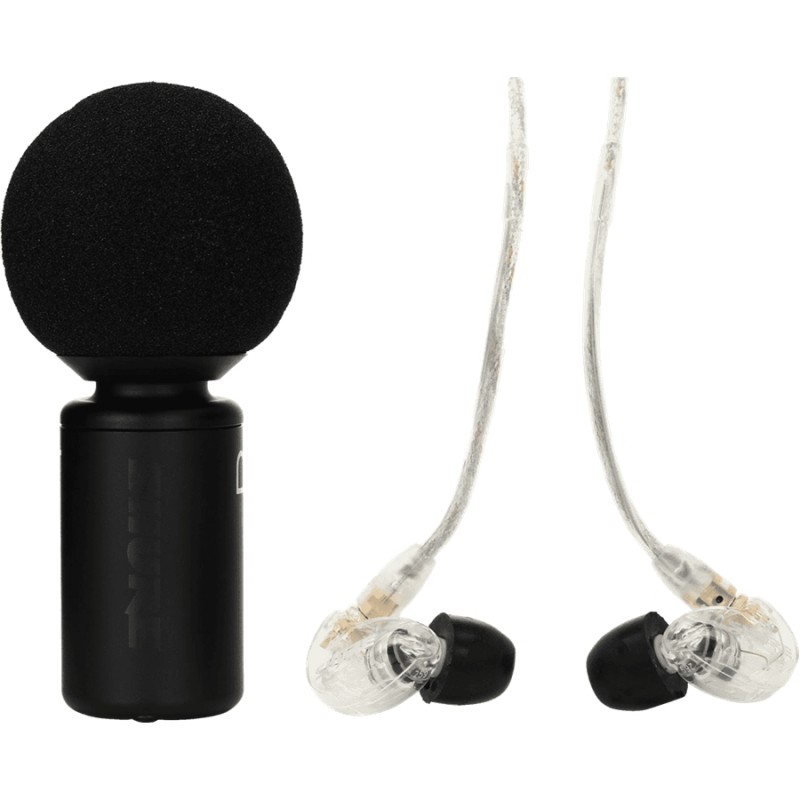 Kit che include il microfono stereo a condensatore professionale Shure MV88 nella colorazione nera e gli auricolari Shure SE215-CL