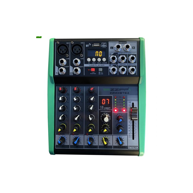 Mixer ZZIPP compatto 4 canali con lettore su USB e interfaccia PC, connettività Bluetooth e multieffetto DSP con 16 effetti. Questo mixer audio dispone di 4 input in totale e ha dimensioni ultra compatte. I due canali microfonici dispongono di alimentazione Phantom +48V, Gain per il guadagno della dinamica, un EQ a tre bande, un regolatore di effetti ed un regolatore di livello. Un canale Stereo aggiuntivo con ingresso Jack offre una connessione professionale per i vostri dispositivi esterni (iPhone, iPad, Smartphone e Tablet). Un canale è dedicato alla gestione completa della connettività Bluetooth o Pen Drive. L'interfaccia audio USB integrata permette la connessione a PC/Mac per registrazioni o riproduzioni. Il processore DSP dispone di 16 programmi con modulatore e livello personalizzabili. Struttura in metallo con alette intercambiabili di colore verde o nero, componentistica di alta qualità e il prezzo contenuto rendono questo mixer audio uno tra i migliori attualmente disponibile in commercio. Ideale per performance live, karaoke o a casa.