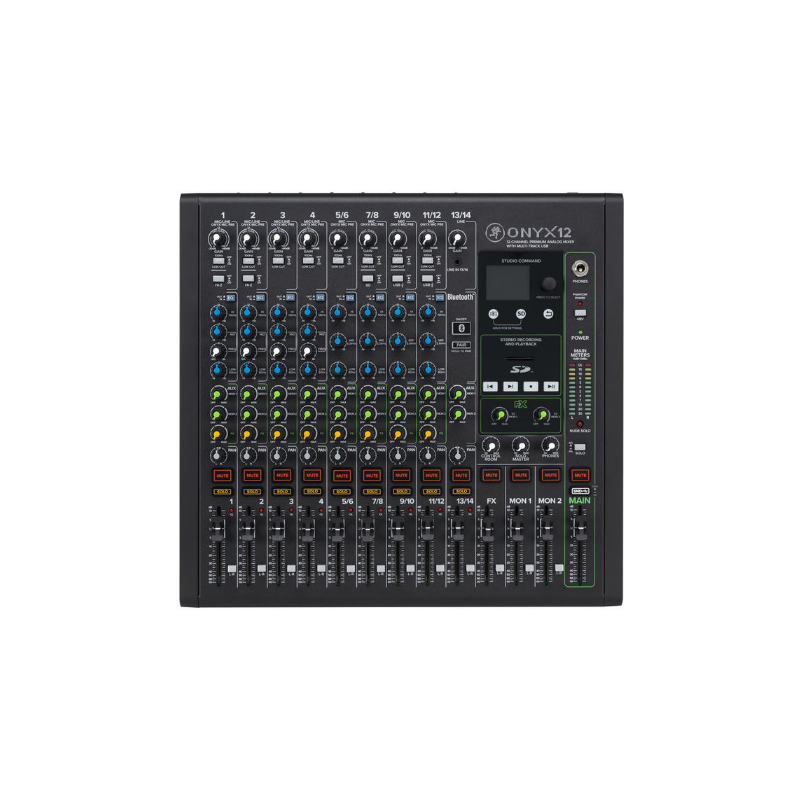 Mackie Onyx12 - mixer a 12 canali; 8 ingressi microfono con 100Hz Low-cut e alimentazione phantom 48V; guadagno fino a 60 dB; EQ a 3 bande; con medi parametrici sui canali 1-4; ingressi Hi-Z per chitarra, basso e altri strumenti; registrazione multitraccia 24 bit/ 96 kHz (14 tracce via USB su MAC/PC); registrazione stereo su scheda SD; registrazione One-touch possibile; ritorno USB assegnabile; riproduzione via SD possibile; 1x ingresso mini jack; streaming Bluetooth; fino a 6 preset utente memorizzabili; processore di effetti integrato con parametri regolabili e un proprio EQ; misuratore di livello a LED; uscita sala di controllo separata; uscita monitor; 6. 3 mm uscita cuffie; PFL/AFL solo; pulsante mute per canale; display a colori; incl. Pro Tools First con The Musician Collection PlugIn Bundle, Waveform OEM con DAW Essentials Bundle