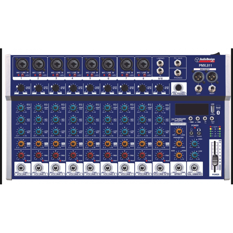 PMX.811- 8 Ingressi Mono Mic (XLR) / LINE IN (Jack bilanciato) - 1 Ingresso Line Stereo (Jack sbilanciato) - 1 Ingresso USB/BT o collegamento PC / MAC (funzione Sound Card In-Out) - EQ +/- 15 dB (Alti 15 KHz - Medi 2,5 KHz - Bassi 80 Hz) su tutti gli ingressi - Indicatore di picco sugli ingressi Mono e Stereo - Regolazione del livello effetti sui canali Mic e Line - Regolazione del livello effetti sul Main - Multi effetto DSP 24 effetti incluso 4 tipi di Reverbero