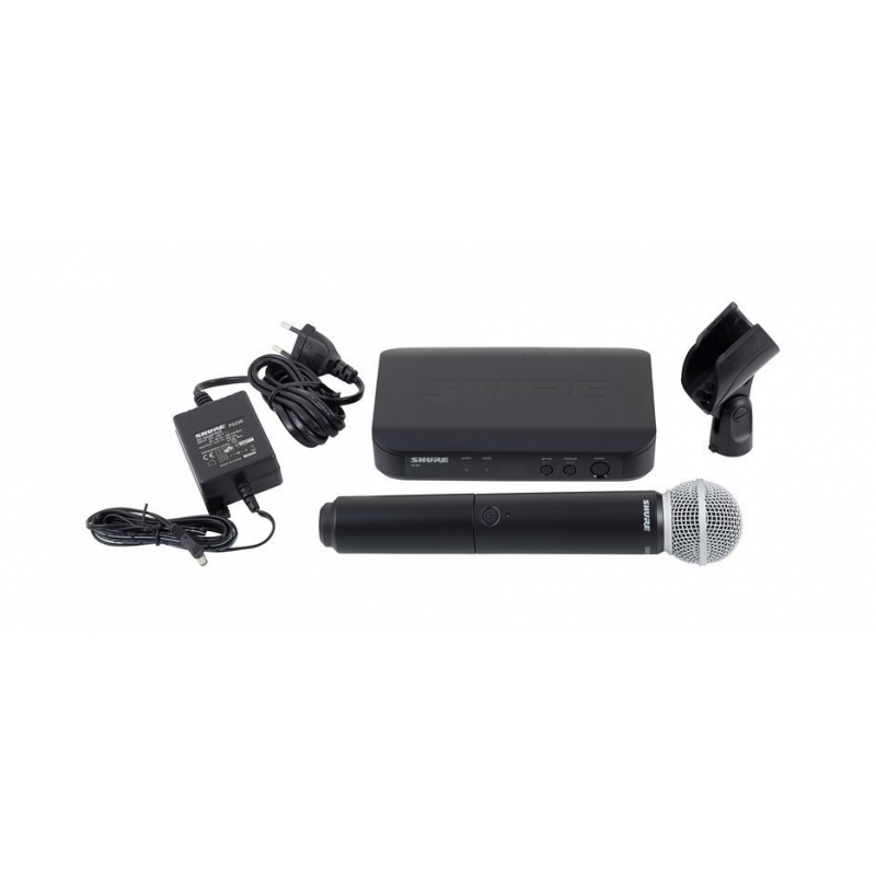 Il set include: Ricevitore radio BLX4E, trasmettitore manuale BLX2 con capsula microfonica SM58, morsetto per microfono
