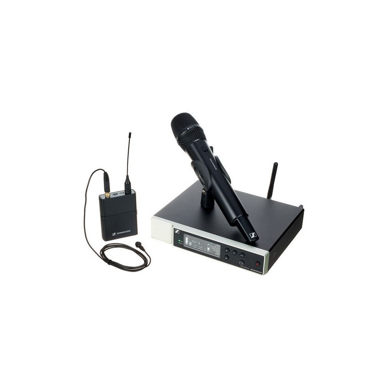 Con microfono lavalier a condensatore ME 2-II (schema polare: omnidirezionale), trasmettitore portatile SKM-S con interruttore mute e capsula dinamica intercambiabile MMD 835 (schema polare: cardioide)