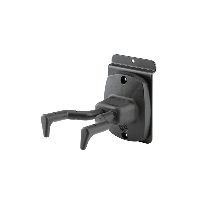 The patented guitar holder 16240 is now also available for Spacewall. The flexible hooking-in and clamping system quickly and firmly grasps the guitar neck when the guitar is put into place and the rubber covered support arms release automatically on removal.