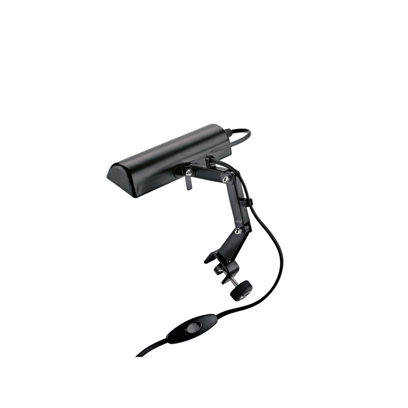 Classic music stand light with black light shade. Three-way tilt adjustment for precise placement. Two meter electrical cable with on-off switch and Euro-style plug. One tubular bulb included. Uses only tubular bulbs with a maximum rating of 25 watts. In-door use only.