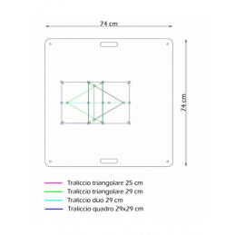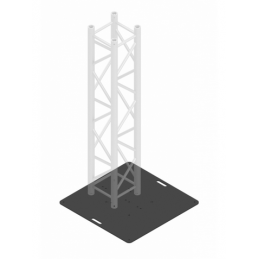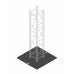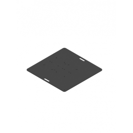 Compatibile con tralicci tubi truss, truss triangolari lato 25 e 29 cm, truss piane 29 cm e truss quadrate 29 cm. Doppio layout di foratura per traliccio centrale o decentrato. Dimensioni 74x74 cm, peso 35 kg. 4 fori filettati M12 ai 4 angoli per aggiunta piedini (KITPM12X4 venduto separatamente). Colore nero goffrato