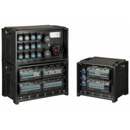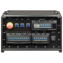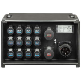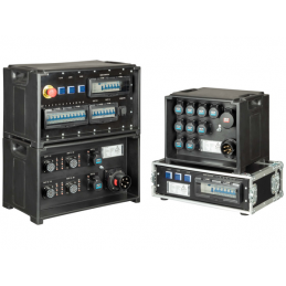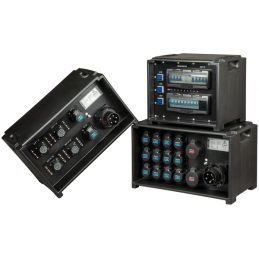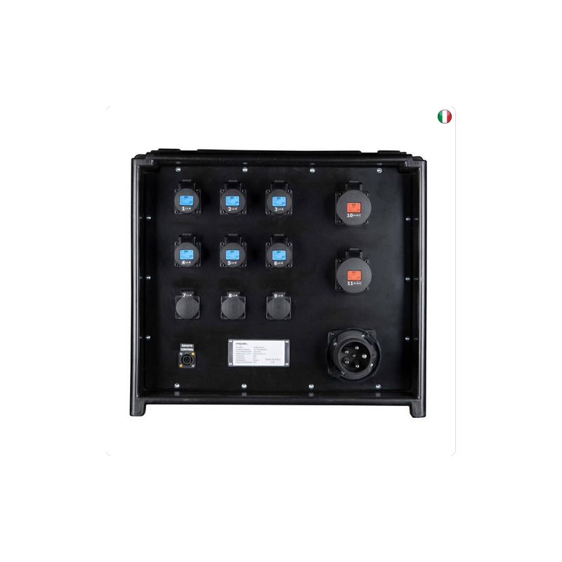Power box portatile IP55 in materiale plastico antiurto. Dotato di: ingresso con spina diritta CEE 63A - 3P+N+T - IP67 - 400V~ - h6 (DIN VDE 0623, EN 60309-2) con protezione differenziale 4P 0.03A 400V~ IEC61008-1/ n. 2 uscite su prese CEE 32A - 3P+N+T - IP67 - 400V~ - h6 (DIN VDE 0623, EN 60309-2)/n° 2 interruttori magnetotermici 32A 4P (3P+N) 400V~/n. 6 uscite su prese CEE 16A - 2P+T - IP44 - 230V~ - h6 (DIN VDE 0623, EN 60309-2) + n. 3 uscite su prese Schuko 16A - 2P+T - IP54 - 230V~ (DIN 49440-1) tutte con interruttore magnetotermico differenziale 16A 2P(1P+N) dedicato. Dotato di pulsante di emergenza a fungo illuminato e di una presa con connettore NAC3FPXTOP per comando di emergenza remoto. Tutti i comandi sono posizionati sotto sportelli in materiale plastico con protezione IP67. Portata massima 63A.