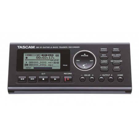 Il GB-10 è un trainer/registratore per chitarra e basso. Come la ben nota serie di allenatori e registratori Tascam CD e MP3, questo modello può rallentare e mettere in loop file audio MP3 o WAV senza cambiare l'intonazione, per aiutare i musicisti a imparare nuovi brani e ritornelli. Il GB-10 dispone di un ingresso da 6,3 mm per chitarra ed effetti come amp modeling, delay e riverbero per far pratica usando una cuffia. Si può regolare il bilanciamento dello strumento con la musica di sottofondo. Sono inclusi anche un accordatore e un metronomo per una precisa riproduzione, e un ingresso pedale permette il controllo a mani libere di diverse funzioni. Il GB-10 offre funzioni di registrazione a qualità CD con possibilità di sovraincisione ed elaborazione di arrangiamenti personali. Una card SD da 2 GB è inclusa nell'unità e il nuovo design da tavolo lo rende uno strumento perfetto per gli studenti di musica, hobbisti o professionisti che vogliono perfezionare la propria abilità.