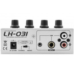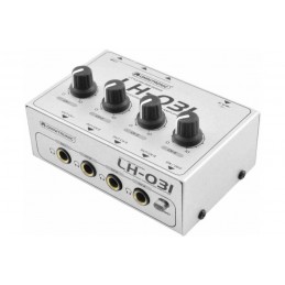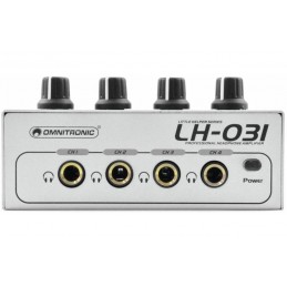 OMNITRONIC LH-031 è un amplificatore per cuffie che distribuisce il segnale di 1 sorgente audio a 4 set di cuffie. OMNITRONIC LH-031 è dotato di un 1 ingresso stereo (commutabile in mono) tramite connettori RCA, jack da 3,5 mm e 6,3 mm, 4 uscite per cuffie controllabili separatamente tramite prese da 6,3 mm e alimentatore fornito in dotazione.