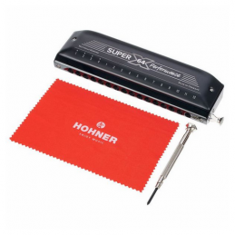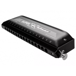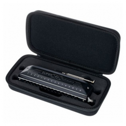 Armonica cromatica Super 64x - Corpo centrale: plastica ABS nera - 64 ance - Accordatura: Do maggiore - Estensione: 4 ottave/Do3 - Re7 - Lamine: 2 x 1,2 mm (doppie), ottone - Lamine incorporate nel pettine (incassate) - Fori tonali rotondi - Sistema Vario Spring per una regolazione facile del cursore con il cacciavite in dotazione (serve anche come banco di lavoro per la manutenzione dello strumento) - Include custodia resistente in nylon con cerniera lampo