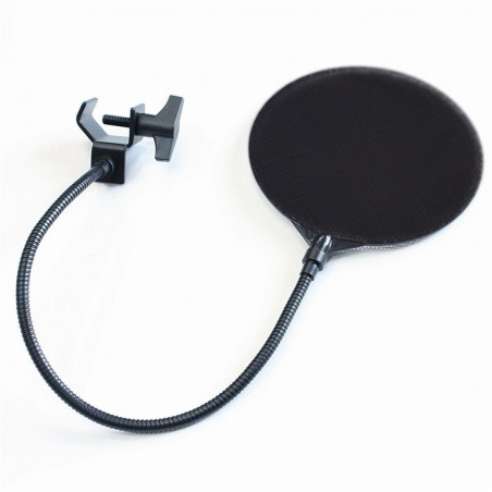 Filtro Anti-Pop professionale per microfoni a largo diaframma, con filtro in tessuto di nylon trasparente al suono. Morsetto e flessibile di migliore materiale e costruzione. Adatto a microfoni da studio di qualità superiore.