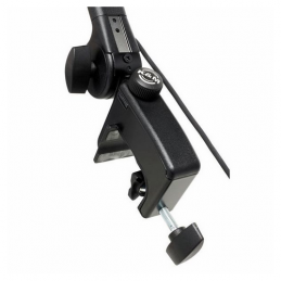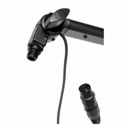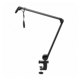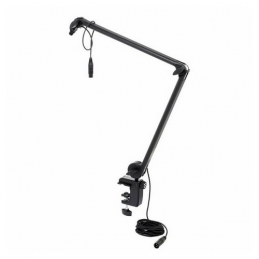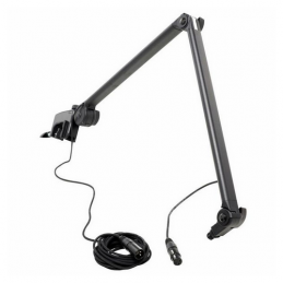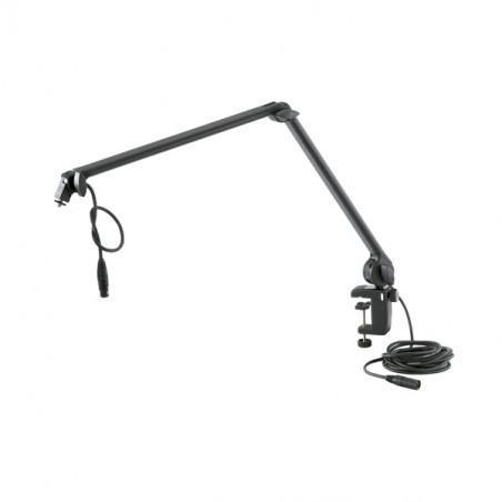 This exclusive microphone arm with a 3/8" or 5/8" thread connector in a modern design with a new innovative table clamp for quick and easy positioning of a microphone in the studio or at a multimedia work station. The 6 m long internally guided microphone cable has a 3 pin XLR plug connector. Microphones to max. 1.5 kg are easily held in any position. The clamping width of 0 to 48 mm allows the clamp to be attached to a wide variety of surfaces. The stable metal construction with high quality plastic inserts guarantees secure and strong hold. The cleverly shaped clamping parts allow the clamp to be used on smooth surfaces and round-shaped tubes. The microphone arm can also be fixed with the table flange 23855 available as an optional extra.