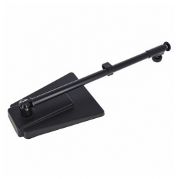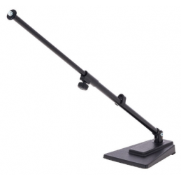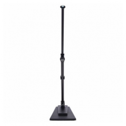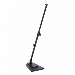 Black rectangular cast-iron base with tilt angle adjustment, 2-piece adjustable extension tubing with non-marring height-adjustment mechanism. Ideal for drums and studios.