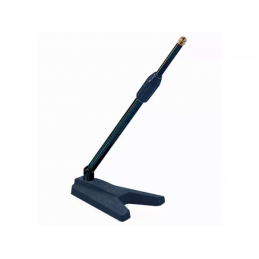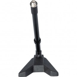 Asta corta regolabile in altezza ed angolazione con base triangolare in acciaio e stelo snodato. Può essere usata a terra per riprendere batterie, amplificatori, o come asta da tavolo per sale conferenza