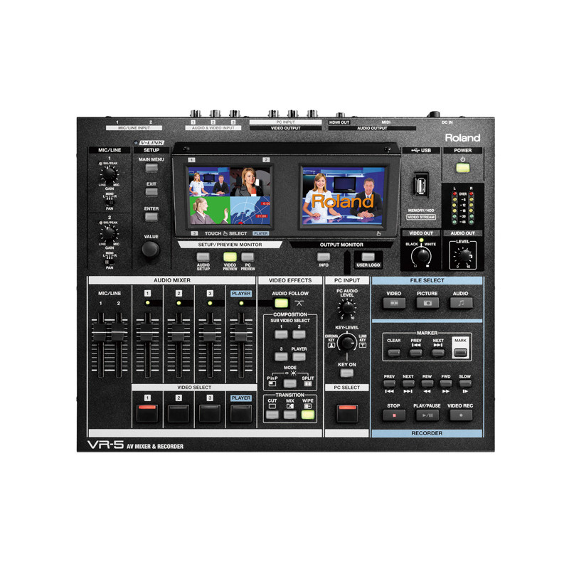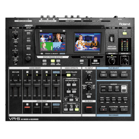 Il VR-5 "All-in-one" semplifica notevolmente la produzione, la registrazione e lo streaming di eventi dal vivo. La riduzione di dotazione hardware, dei tempi e della complessità di configurazione, garantiscono una connessione senza problemi. Una soluzione di facile utilizzo per qualsiasi evento. Caratteristiche principali 5-Channel Video Switcher (3 video sources, PC input, video playback) 2 Mono and 5 Stereo Mixable Audio Channels Built-in scan converter for PC input Built-in dual LCD monitors with touch control Three video layers for 2 video sources plus DSK MPEG-4 player/recorder USB video/audio class device for web streaming Specifiche tecniche VIDEO: Video format: [Video] NTSC or PAL (ITU601)' [PC-RGB] 640 x 480/120 Hz, 800 x 600/120 Hz, 832 x 624/75 Hz, 1024 x 768/80 Hz, 1152 x 864/80 Hz, 1152 x 870/75 Hz, 1280 x 1024/75 Hz, 1600 x 1200/60 Hz (RGB VH: positive/negative logic). Video Sampling Rate: [Video] 4:2:2 (Y:B-Y:R-Y), 8 bits, 13.5 MHz Frame Synchronizer: 5 systems Input Level and Impedance: [Video (composite)] 1.0 Vp-p, 75 ohms [S-video] Luminance signal: 1.0 Vp-p, 75 ohms Chrominance signal: 0.286 mVp-p, 75 ohms (NTSC) /0.3 mVp-p, 75 ohms (PAL) [PC-RGB] 0.7 Vp-p, 75 ohms (H, V: 5 V TTL) Output Level and Impedance: [Video (composite)] 1.0 Vp-p, 75 ohms [S-video] Luminance signal: 1.0 Vp-p, 75 ohms Chrominance signal: 0.286 mVp-p, 75 ohms (NTSC) /0.3 mVp-p, 75 ohms (PAL) Connectors: [Input] Video (composite): BNC type x 3, S-video: 4-pin mini DIN type x 3, PC-RGB: D-Sub 15-pin Shrink type x 1. *Inputs 1 to 3: When S-video is simultaneously input to 1 to 3, S-video takes priority [Output] Video (composite): BNC type x 2, S-video: 4-pin mini DIN type x 2 [Preview Output] Video (composite): BNC type x 1 AUDIO: Internal Processing: Sample Rate: 24-bit/48.0 kHz Input Level: [AUX AUDIO INPUT] +4 dBu to –62 dBu (variable) Max: +22 dBu' [Channel 1/2/3] –10 dBu Max: +8 dBu [PC AUDIO] –15 dBu Max: +3 dBu Input Impedance: [AUX AUDIO INPUT] XLR type: 4 k ohms, TRS phone type: 6 k ohms, [Channel 1/2/3 and PC AUDIO] 15 k ohms Input Connectors: [AUX AUDIO INPUT] XLR-3-31 type (balanced, phantom power), 1/4 inch TRS phone type (balanced/unbalanced): TRS type takes priority, [Channel 1/2/3] RCA phono type [PC AUDIO] Stereo miniature type Output levels: [AUDIO OUTPUT] –10 Output Level dBu Max: +8 dBu [PHONES] 50 mW + 50 mW Output impedance: [AUDIO OUTPUT] XLR type: 600 ohms, TRS phone type: 1 k ohms, [PHONES] 10 ohms Output Connectors: [AUDIO OUTPUT] XLR-3-32 type (balanced), RCA phono type, [PHONES] Stereo 1/4 inch phone type