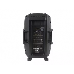 Diffusore combo trolley amplificato. 2 vie da 400 W e 800 W di picco – Alimentazione a corrente e/o a batteria – 50–20.000 Hz – Tweeter da 1" – Woofer da 15" – 2 ingressi line con regolazione separata del volume – 2 ingressi microfonici con regolazione del volume e dell'echo – 1 ingresso instrument con regolazione del volume e dell'echo – ingresso mp3 – Master generale con regolazione separata di alti, bassi ed echo – Ingresso sbilanciato – in/out per collegamenti in cascata – Lettore USB ed SD card integrato – Ricevitore Bluetooth per collegare qualunque sorgente esterna in wireless (Bluetooth) – Il lettore ha le seguenti funzioni: play/pause/ffww/rew oltre allo skip della traccia e alla funzione random play – 2 Radiomicrofoni con ricevitore integrato e regolazione sparata del volume oltre a regolazione dell'echo – trolley – cabinet in abs