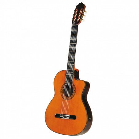 La chitarra classica elettrificata Esteve Elec è amplificata con il Fishman Prefix Pro. totalmente all-solid con top in Cedro, fasce e fondo in Palissandro Indiano, manico in Mogano e tastiera in Ebano. Tutti gli strumenti prodotti da Esteve sono famosi per l'eccellente qualità dei materiali e delle finiture, che insieme al loro suono ineccepibile rendono l'esperienza di suonare e ascoltare una chitarra Esteve un momento indimenticabile. La passione e la dedizione che ha reso celebre a livello internazionale la società Esteve è garantita grazie al lavoro costante e minuzioso dei maestri liutai spagnoli. Ogni strumento Esteve è il riflesso di un lavoro fatto a regola d'arte.