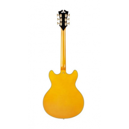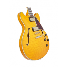 Questa moderna semi-hollow a doppia spalla mancante, ci regala altissime prestazioni grazie alle attenzioni costruttive e ai materiali finemente scelti. Dotata di 2 pickup humbucker '59 Seymour Duncan, con la possibilità di splittare a single coil in unica bobina, questa semiacustica ci assicura suoni rotondi, pieni e ricche di armoniche unitamente ai suoni graffianti rock tipici dei pick-up single coil. Top, fondo e fasce in acero fiammato, tastiera in Palissandro, manico con C-shape in acero 3 pezzi, meccaniche dorate Grover Super Rotomatic, segnalasti in madreperla, ponte con stop-bar, colore Vintage Natural, finitura lucida.