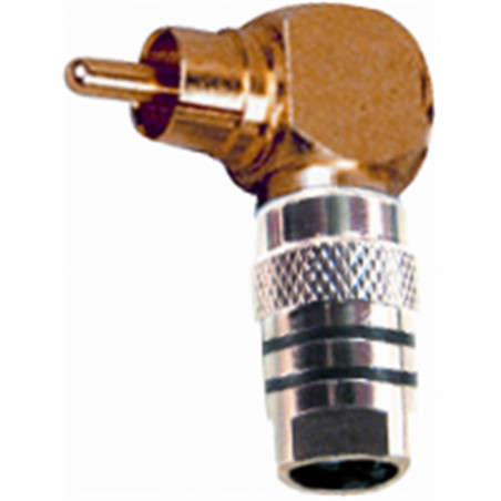 Connettore RCA maschio a 90° in metallo nikelato con contatto dorato e indice nero.