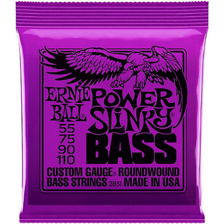Ernie Ball Power Slinky Bass sets are wound for a bright, balanced tone. Each bass string is manufactured with the finest and freshest raw materials in the beautiful Coachella Valley of Southern California. The list of endorsers for Ernie Ball Slinky bass strings reads like a who's who of top selling artists. Gauges .055, .075, .090, .110