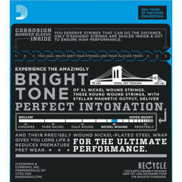 Le XL Nickel Wound, le corde D'Addario più famose per chitarra elettrica, hanno un'anima esagonale in acciaio al carbonio rivestita con precisione in acciaio nichelato. Ne risultano corde caratterizzate da un timbro brillante e duraturo e da un'intonazione eccezionale, perfette per un'ampia varietà di chitarre e generi musicali.