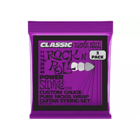 CORDE 3250 è il pack da tre set di corde per chitarra elettrica della serie "Power Slinky" di casa Ernie Ball con scalatura 0.11 - 0.48. Sono realizzate con un filo in puro nichel avvolto su un'anima esagonale in acciaio placcato a stagno. Producono un suono caldo e ricco di armoniche, ideali per musica rock.