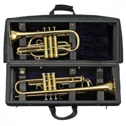 The Quad Case has a suspension system in which the trumpets are suspended between removable/interchangable rubber blocks that are colour coded for easy use. By suspending the trumpets we offer maximum protection. The case shells are solid, but very light and comfortable to carry. All mutes and accessories can be carried inside the case instead of one of the trumpets.