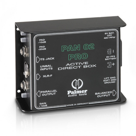 The Palmer PAN02 PRO is an active DI-box with outstanding additional functions. These include an unbalanced XLR input, in addition to the 3-way attenuator -10, -20, -30 dB and a switchable gain of 12 dB, connected with a maximum output voltage of +20 dBu. The Groundlift switch has a "lift" position allowing adjustments between a "soft and hard grounding" . The balanced output is achieved with a high quality transformer in the Mumetall housingthat was specially developed for this purpose. The PAN02 Pro can be powered either with a 9 V battery or 48 V phantom power. A two-colour LED indicates which source supplies the power.
