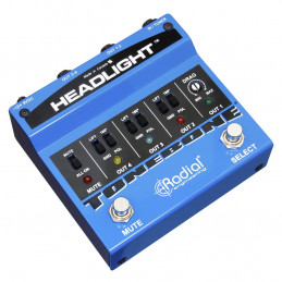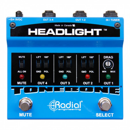 Headlight™ è un selettore di amplificatori per chitarra a gain unitario progettato per integrarsi facilmente in una pedaliera e permettere all'artista di scegliere in modo trasparente tra un massimo di quattro amplificatori utilizzando un unico interruttore a pedale. La magia dietro il design compatto è la combinazione delle prese di uscita da ¼ e un interruttore a pedale sequenziale innovativo che avanza attraverso le uscite collegate a seconda di quanti amplificatori sono connessi. È