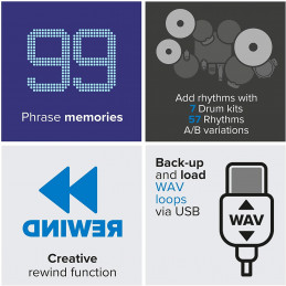 Con 57 ritmi preset e sette diversi drum kit, RC-5 è pronto per spingere al massimo i tuoi loop ed i momenti di studio con groove pieni di ispirazione per qualsiasi stile musicale. Per ogni ritmo, puoi selezionare le variazioni A/B dal pannello o controllarle via MIDI durante l'esecuzione. Il looper interno dell'RC-5 include anche l'interessante funzione Reverse, perfetta per donare originalità alla vostra musica.