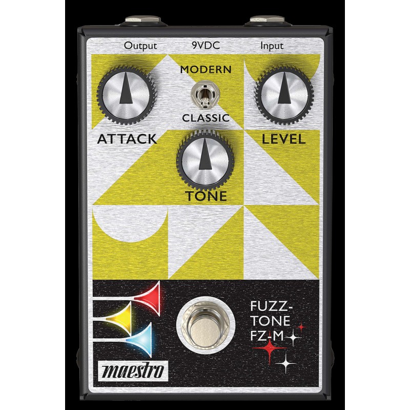 Maestro created the world’s first fuzz pedal – the Maestro Fuzz-Tone FZ-1. Introduced in 1962, the Fuzz-Tone became the sound of rock and roll and a must-have accessory for guitarists everywhere after the success of 1965’s (I Can’t Get No) Satisfaction by the Rolling Stones, which prominently featured its cutting edge sound. Now Maestro is bringing the fun and sonic fury of those early Fuzz-Tones back with the new Maestro Fuzz-Tone FZ-M. This all-analog pedal boasts a Mode toggle switch that provides two pedals in one functionality for increased sonic versatility with both an FZ-1 inspired fuzz sound and a thicker, more modern fuzz tone. Its 3-knob control layout gives you intuitive control. The Attack knob controls the amount of fuzz. The Tone control lets you adjust the timbre from bright and raspy to warm and wooly and anywhere in between. Use the Level control to set the output volume; it can go way beyond unity gain when desired. The true bypass footswitch triggers the LED lights in the bugles in the Maestro logo when it’s on, so you’ll always know when the effect is active.