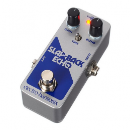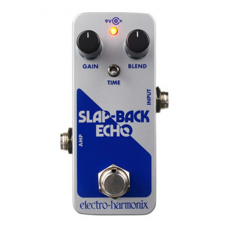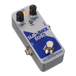 Alloggiato nello chassis di dimensioni Pico di EHX, lo Slap-Back Echo è dotato di manopole Gain e Blend e di uno switch Time. La manopola Gain controlla il segnale in ingresso prima del circuito eco e regola anche il volume generale in uscita con un boost fino a +20dB. La manopola Blend miscela il segnale dry e il segnale eco da 100% dry a 100% echo. Lo switch Time seleziona tre diversi tempi di delay: 45ms, 65ms e 100ms.