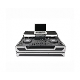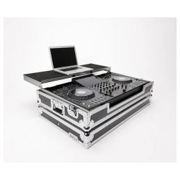 flight case in grado di contenere un set composto da controller table top tipo Pioneer XDJ XZ, 1 elettronica rack mount 19" da 1 u rack come ad esempio un ricevitore per radiomicrofoni e laptop fino a 17” – questo modello impiega un piano rialzato a slitta per posizionare laptop ed altri device – grazie al particolare disegno dello chassis questo modello permette di trasportare il materiale già installato senza rischi per il trasporto – ruote per il trasporto a traino
