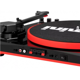 hifi system composto da giradischi e diffusori – caratteristiche giradischi: trazione a cinghia – amplificatore interno – ricevitore Bluetooth interno per suonare le tracce audio da qualunque device – uscita line RCA per il collegamento a un mixer o a un amplificatore esterno – pitch control – regolazione del volume – selettore 33/45/78 giri – braccio dritto – testina – design ultra slim – chassis color nero – il sistema si completa di una coppia di diffusori passivi a due vie da 25 W cadauno con cabinet colore nero e frontale rosso