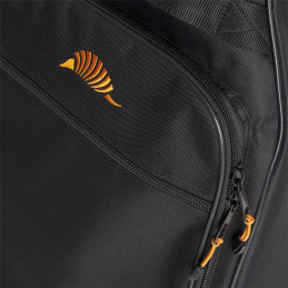 La zip da 10 mm con tira cursori in elastico arancione garantisce una chiusura affidabile e agevole. La tasca frontale, arricchita dal logo "Armadillo" ricamato, presenta due scomparti con zip e divisori, offrendo uno spazio comodo per accessori e piccoli oggetti.