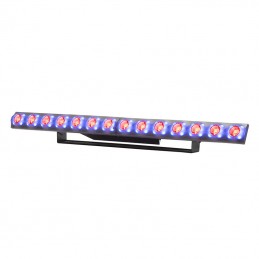 Eliminator Lighting Frost FX BAR RGBW è un apparecchio lineare da 1 metro per l'illuminazione di intrattenimento che crea lavaggi di colore ed effetti di inseguimento cromatico mozzafiato. Dispone di due tipi di LED colorati in un unico apparecchio. Dispone di quattordici LED RGBW da 3W con lente ACL sulla parte anteriore dell'apparecchio per creare intensi effetti di fascio di colore. Inoltre, ha ottantaquattro LED RGB SMD dietro una lente di plastica smerigliata che creano modelli di inseguimento di colori incandescenti. Entrambe le serie di LED funzionano in modo indipendente.