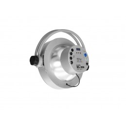 EUROLITE ML-300 ABL Spot è un proiettore di medie dimensioni con lampada alogena e illuminazione ambientale a LED. Sotto il coperchio della griglia, i LED rossi, verdi e blu sono nascosti per illuminare completamente l'ampio riflettore. Al centro viene utilizzata una lampada GY 9,5 da 300 W, non inclusa nella fornitura.