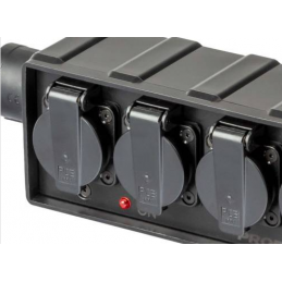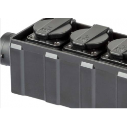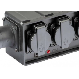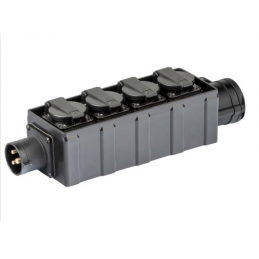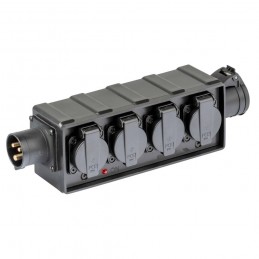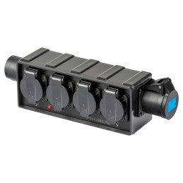 Box di distribuzione elettrica a 4 canali con ingresso spina CEE 16A - 2P+T - IP44 - 230V / uscita 4 x presa Schuko bivalente 16A German / 10A IT 16A - 2P+T - IP54 - 230V e rilancio su CEE 16A - 2P+T - IP44 - 230V. Carico massimo applicabile 16A.