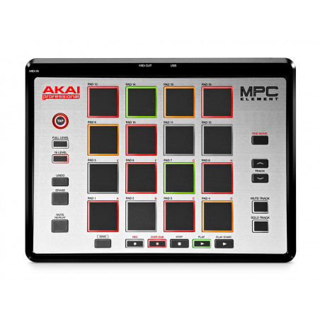 Akai Professional MPC Element è un MIDI controller hardware collegabile via USB a Mac, PC e iPad (tramite Apple Camera Connection Kit) costruito attorno ad uno chassis in alluminio di soli 17mm di spessore per un peso di circa 800 grammi, dotato di 16 pad e pulsanti retro-illuminati e di una cover protettiva integrata. Definita dai progettisti come "la MPC per tutti", MPC Element include le classiche funzioni Note Repeat, Swing, 16 Level, Full Level, Tap Tempo e, come nelle ammiraglie MPC Renaissance e MPC Studio, i pad multicolore retroilluminati sensibili alla pressione e alla velocity. L'hardware MPC Element invia messaggi MIDI standard quindi può essere utilizzato come controller a pad per qualsiasi software musicale MIDI compatibile in ambiente Windows e Mac. Oltre al collegamento USB (in dotazione viene fornito il cavo USB), utile anche per l'alimentazione, MPC Element dispone delle porte MIDI IN e MIDI OUT su connettori DIN per interfacciarti all'occorrenza con altri strumenti hardware MIDI. Il software MPC Essential (gratuitamente scaricabile dal sito web AKAI) con la sua wavetable da 1GB di samples inclusi rappresenta il cuore sonoro del bundle MPC Element: un software che opera a 32 e 64-bit, con 64 voci di polifonia e che supporta file nei formati audio Wav e AIFF. I 16 pad fisici si articolano su 8 banchi virtuali del software, per un totale di 128 pad ai quali potremo assegnare samples. Il software MPC Essential funziona sia in modo indipendente (stand-alone) grazie al mini sequencer integrato, oppure come plug-in all'interno della tua DAW (Cubase, Logic, Ableton Live, etc.) compatibile VST, RTAS, o AU.