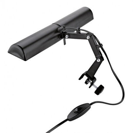 Double music stand light (320 mm) with black light shades. Three-way tilt adjustment for precise placement. Two meter electrical cable with on-off switch and Euro-style plug. Two tubular bulbs included. Uses only tubular bulbs with a maximum rating of 25 watts. In-door use only. CE-mark.