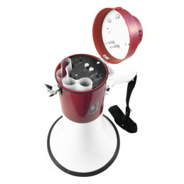 Megafono 18 W RMS dotato di sirena commutabile e impugnatura a pistola, completo di tracolla.
